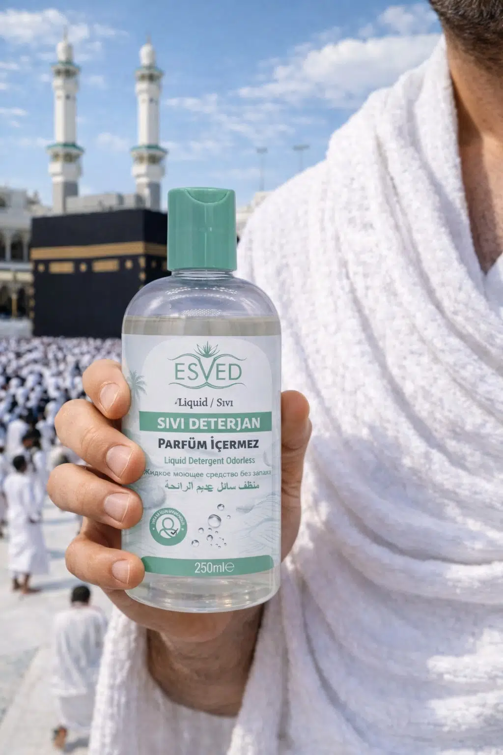 Esved Kokusuz Sıvı Deterjan, hac ve umre ziyaretlerinde ihram ve kişisel eşyaların temizliği için Türkiye’de ilk kez özel olarak üretilmiş pratik bir temizlik ürünüdür. Tamamen kokusuz yapısı sayesinde ihram kullanımına uygundur ve ince kumaşlarda güvenle kullanılabilir.